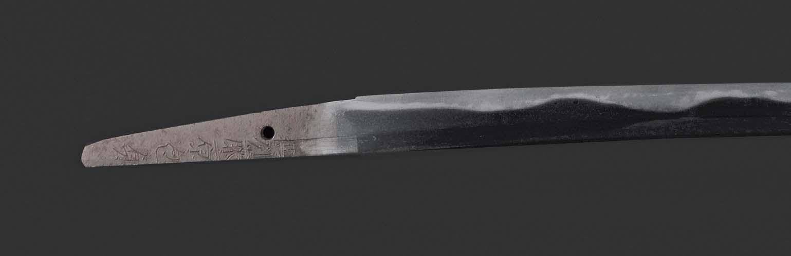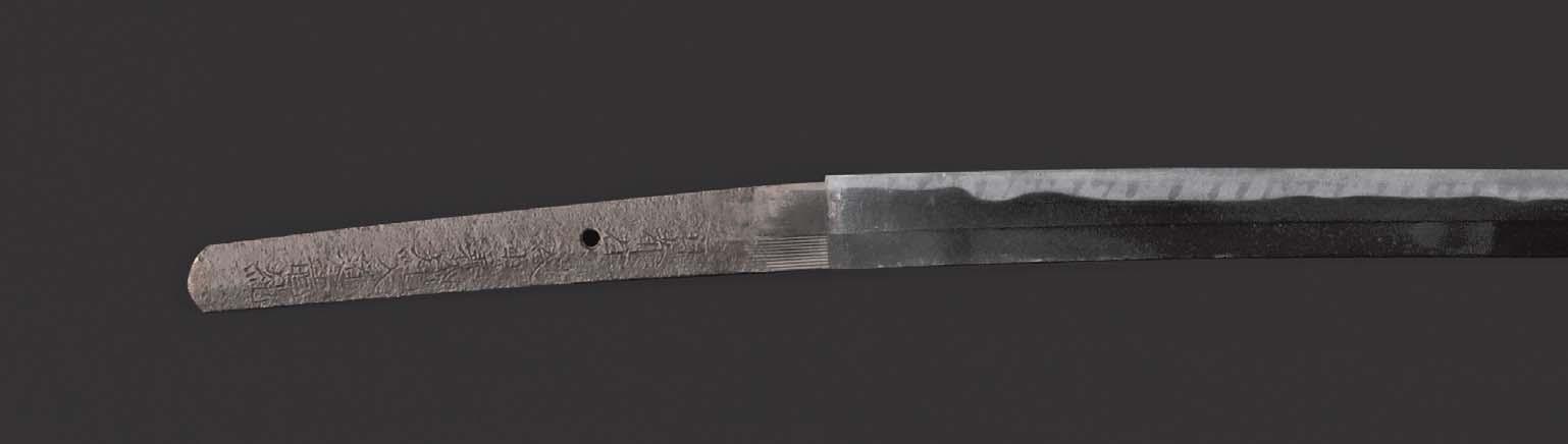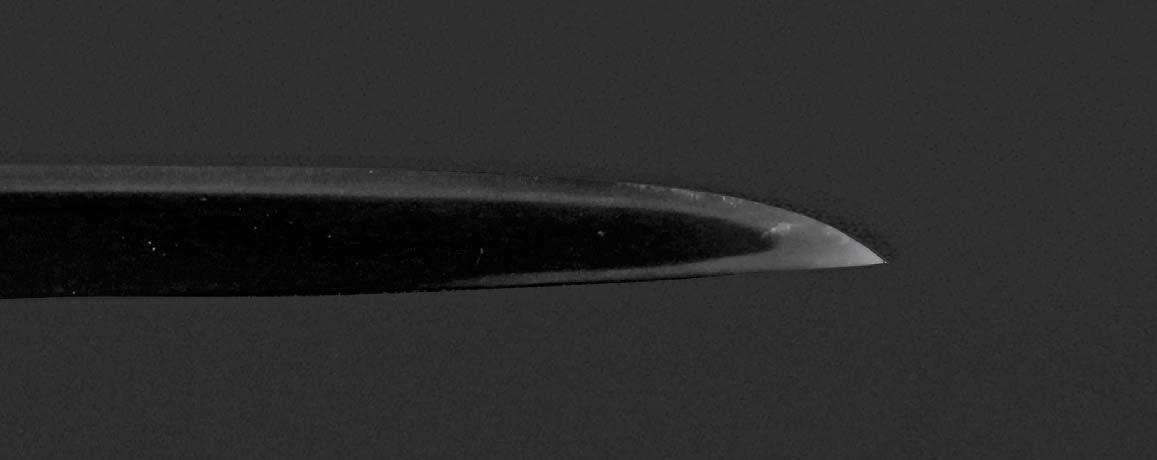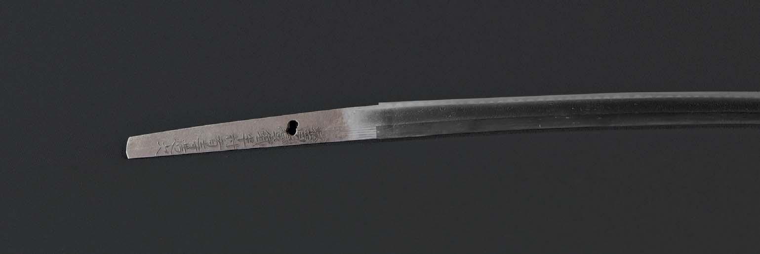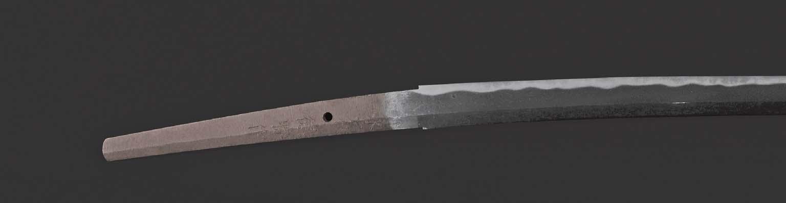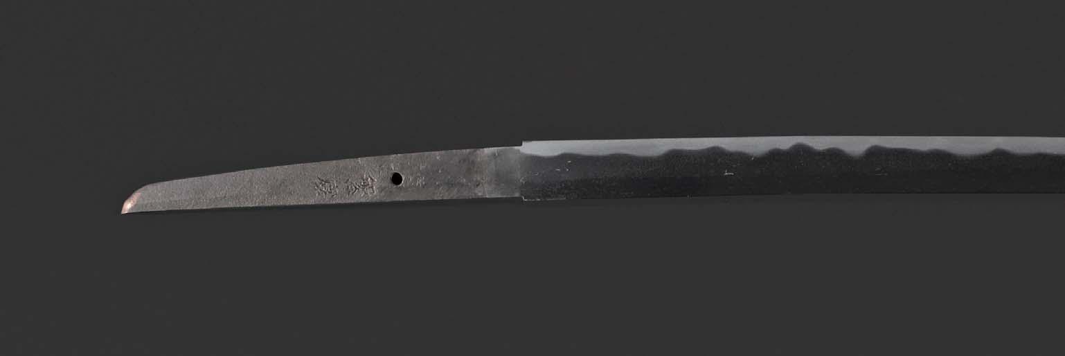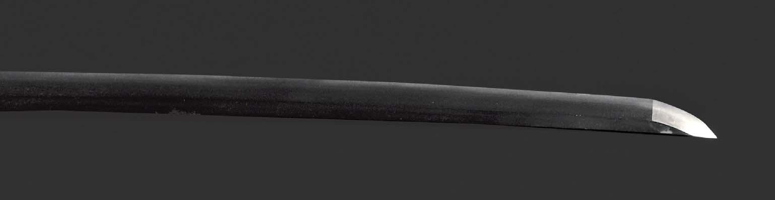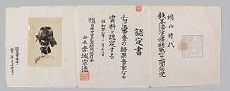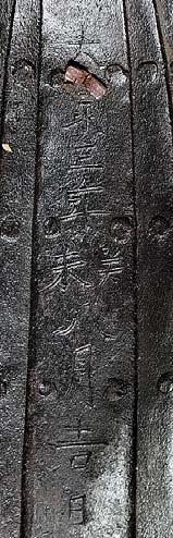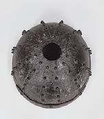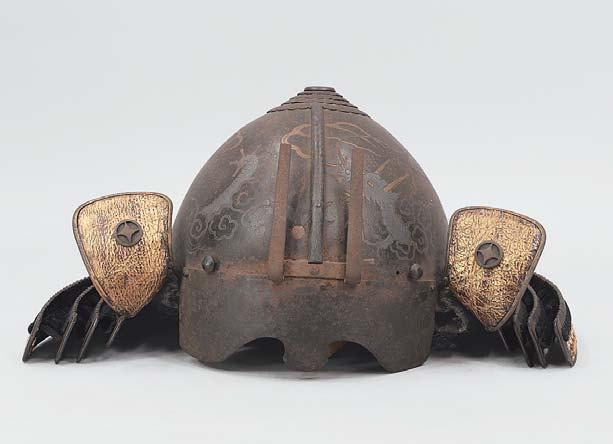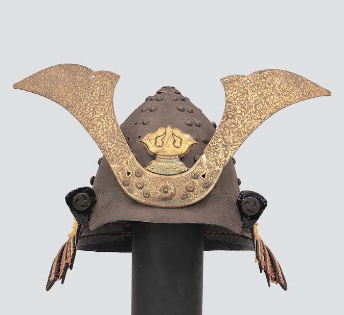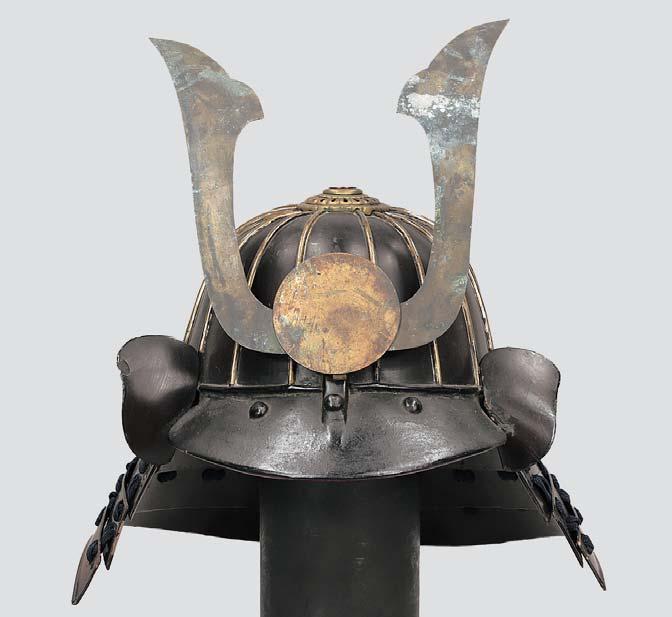 C-026 鉄黒漆塗六十二間筋兜 ¥1600000~ 前正中銘:明珎信家(花押) 後正中銘:大永三年癸未(1523)八月吉日 矧板は整然としており、六十二枚を一行六点の鋲で留める。筋立も端正で、八幡座は金銅裏菊を底として菊透、小刻二段、抱花に玉縁を重ねた六段。四天 鋲と響孔は鉢中程に設け、四色啄木の綰を出す。笠印付鐶は金銅素文鋲頭とし、高めに打つ。当世形の眉庇は絵韋貼(文様不鮮明)とし、黒漆塗の祓立台を 置いて小刻座金の三光鋲で留め、鍍金素文覆輪を廻らす。