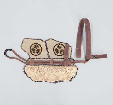 撫角形の吹返は眉庇に通底し、金銅「一文字三星紋」の据金物を打つ。 は五段、細い板札を素懸に威し、耳絲と畦目、菱縫を飾る。腰巻板は水平方向に 伸びており、 一段目はこれに沿って湾曲する。