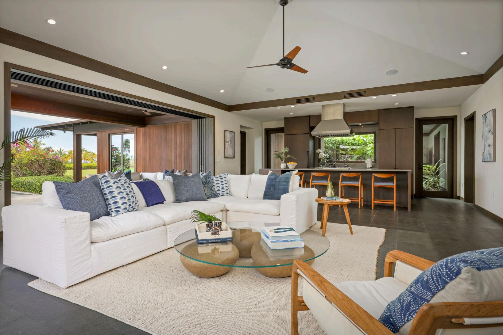 Custom mahogany pocket doors open the great room to a spacious covered lanai, creating a seamless indoor-outdoor living experience perfect for entertaining or relaxing in the peaceful Kona breeze.
