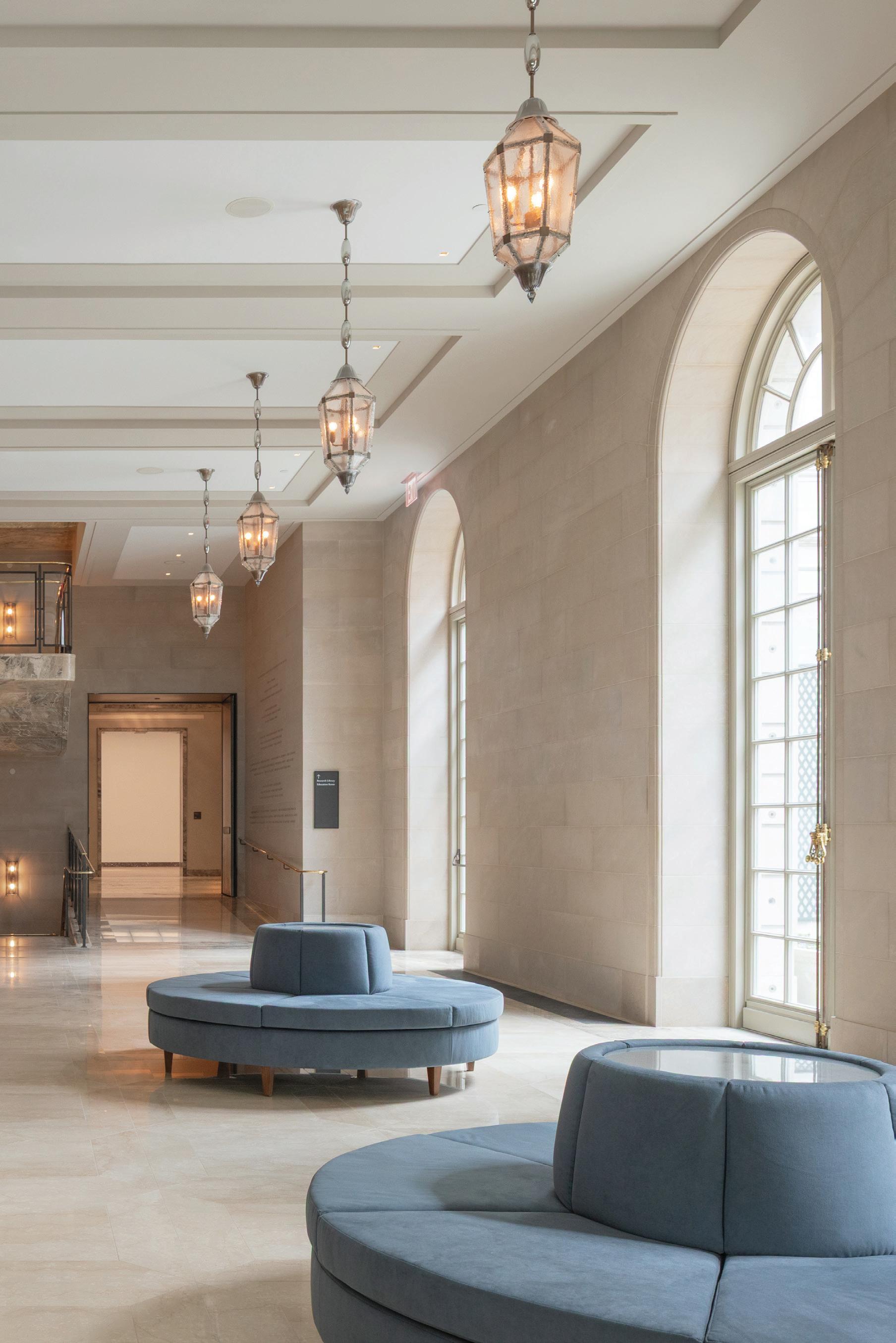 Originally constructed in the 1970s, the renovated Reception Hall now features a lower ceiling and a raised roof, creating a second floor for an expanded museum shop and the Frick's first café.