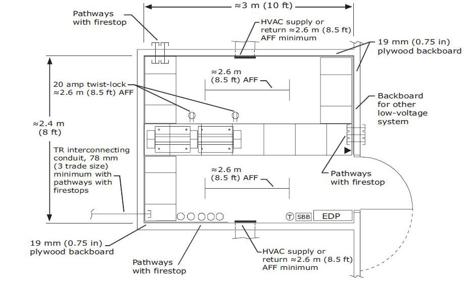 for IT equipment rooms (ERs) and telecommunications rooms (TRs) is found in ANSI/TIA-569-E, Telecommunications Pathways and Spaces. The BICSI TDMM (14th edition) manual also recommends a standard size and equipment layout for TRs (See Figure 1: Telecom Room Layout).