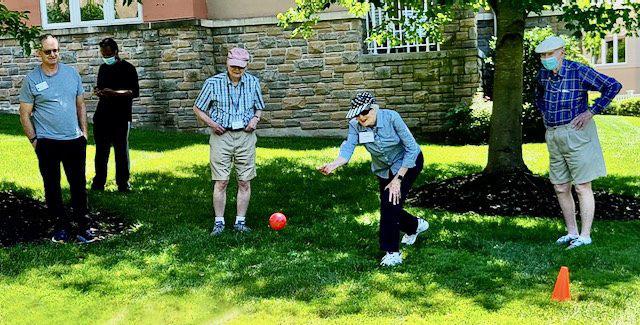In 2022, bocce came to Kendal when Fitness Coordinator Cathy DiSomma decided to introduce an outside activity to the Fitness Center schedule. The idea of bocce was a natural for her, given the frequent bocce games that were part of every get-together of her Italian relatives during her childhood. There was one problem, though: a bocce court calls for a terrain that is relatively flat and of a certain size. But in her exploration of the Kendal campus, Cathy found the almost perfect spot: the garden area between Alida and Robert Fulton.
