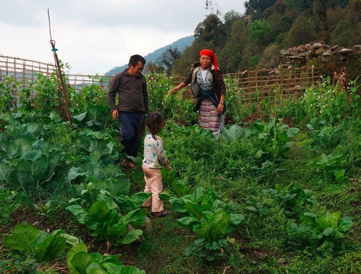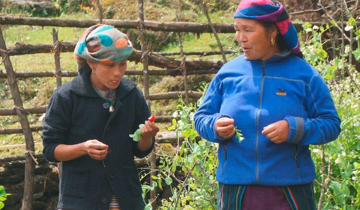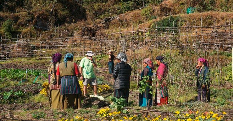 Pour améliorer les conditions alimentaires de la population , il a semblé approprié d’initier principalement les femmes, traditionnellement garantes des cultures, à la permaculture. Les techniques utilisées, vectrices d’amélioration et de complémentarité, respectent le savoirfaire local et ont l’avantage de varier et densifier la récolte. Thendi Sherpa — véritable courroie de transmission entre ce monde retiré et l’engagement des amis occidentaux — joue un rôle indispensable dans le lancement de ce projet. De nombreuses familles ont découvert la joie de subvenir à leurs besoins alimentaires par leurs propres moyens.
