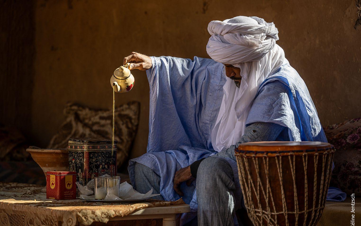 Madani sert le traditionnel thé de bienvenue. Il nous explique que la mousse créée à la surface protège du sable et des insectes – ©CelineJentzsch image ©SamuelBitton