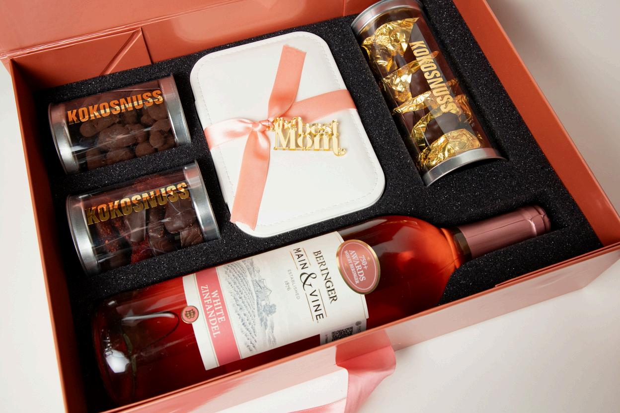 CAJA ARCH: VINO ROSA MINI, 120 G NUECES CONFITADAS,