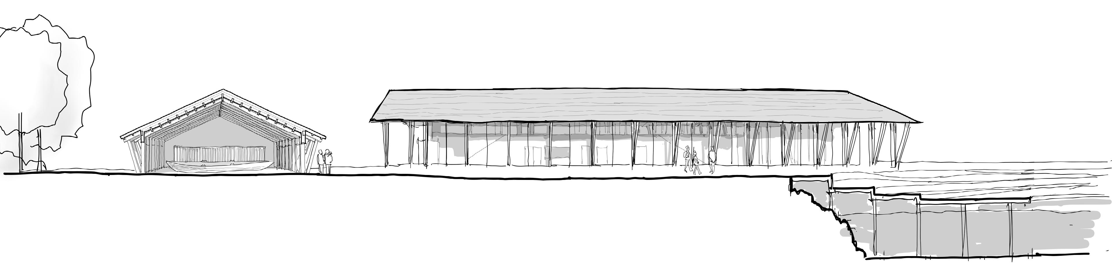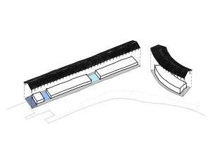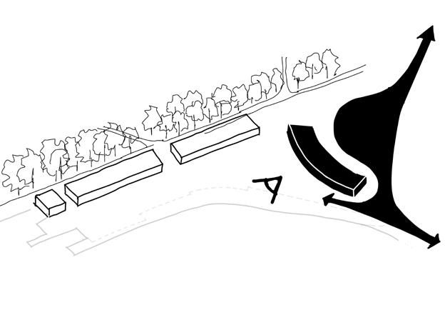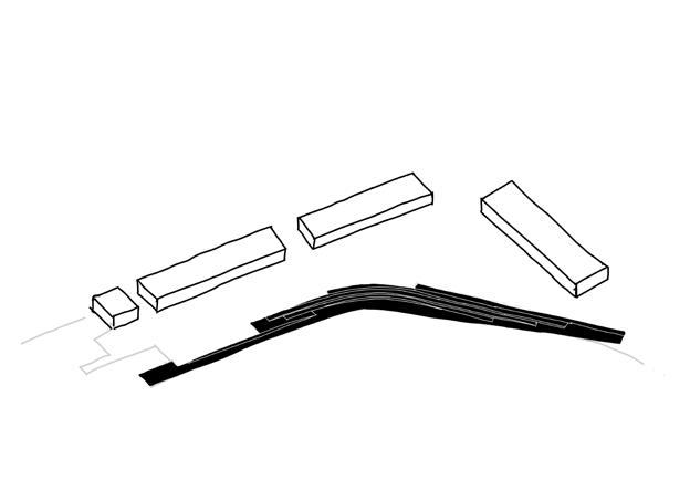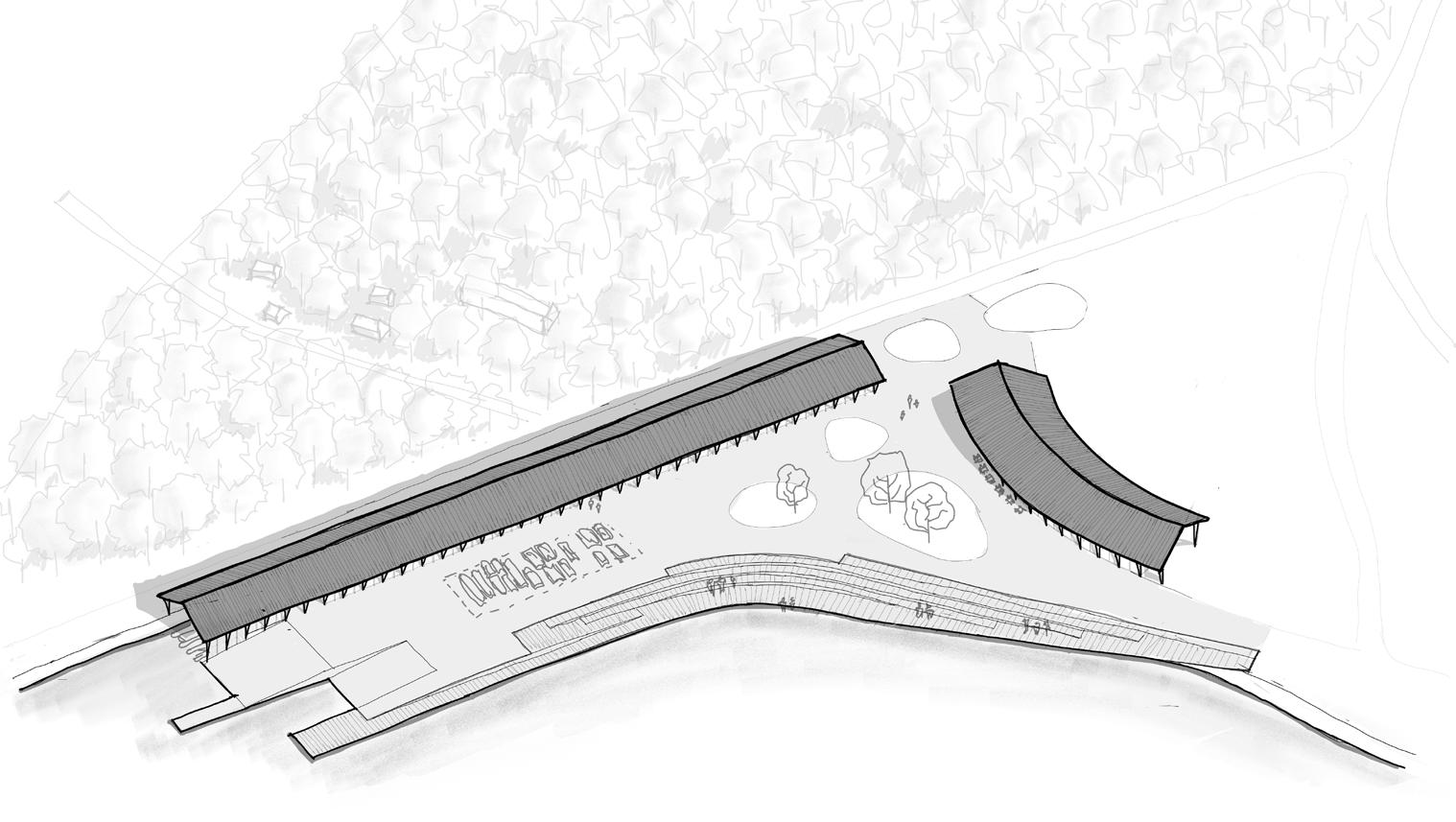 Our team decided to split the program into two linear volumes. The curved building was dedicated to social activities with a gastronomy unit, rooms for social clubs and a possibility to join the ground floor space into a big event space. The straight one with direct connection to the water, was supposed to house mainly storage rooms for sports equipment and changing rooms.
