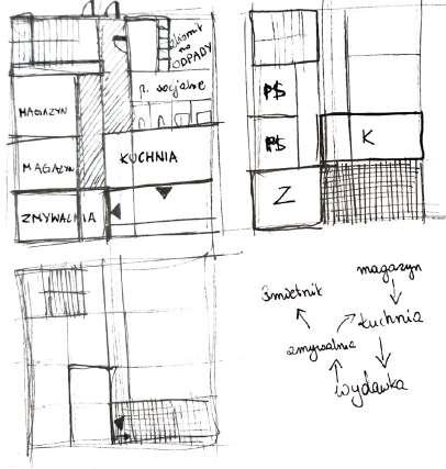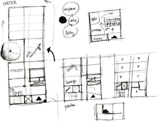 Division of the site into six parts corresponding to neighbouring mansions seemed natural according to the existing context. The next step was to place the functions. I decided to accommodate the hotel lobby on the south as it is the main function of the development. The residential part of the hotel was meant to be on the first and second floors. In the next module, the student canteen was located.