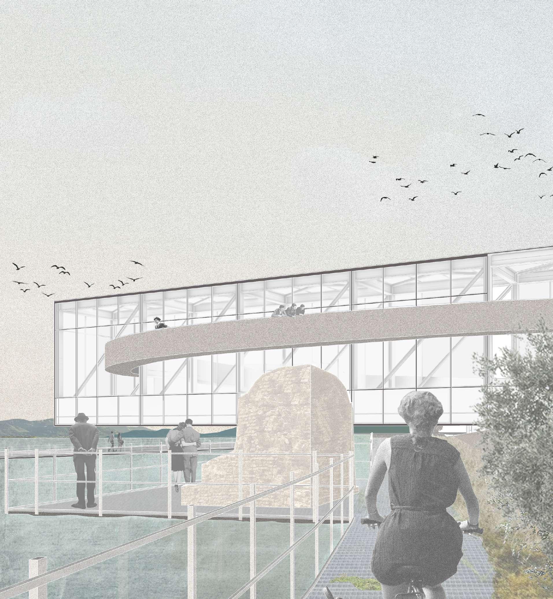 During the thematic seminar we could choose a site located in Italian region of Calabria and then choose a theme to guide the design process. We have chosen a picturesque archaeological site of ruined Roman villa called "Villa Romana di Larderia" with alluring preserved mosaics. The ruins are located by the Esaro Lake and close to the Farneto woods. Inspired by the superimposition of various layers shaped by both humans and nature we have decided on palimpsest as similarly to such piece on which later writing has been superimposed on earlier text, the location witnessed various eras and each left its mark on the context. The Over-Time design aims to integrate ancient relics with contemporary architecture, enhancing the connection between the archaeological site and the lake. It features an organic ramp for access, guided by the ancient modular grid and the surrounding agricultural fields, suggests a careful consideration of the site's natural features and historical influences, blurring boundaries between interior and exterior spaces. The main building is a translucent volume, interacting with the landscape and serving as an exhibition space for the archaeological relics. Its goal is to create an immersive experience where the landscape becomes an integral part of the museum journey.