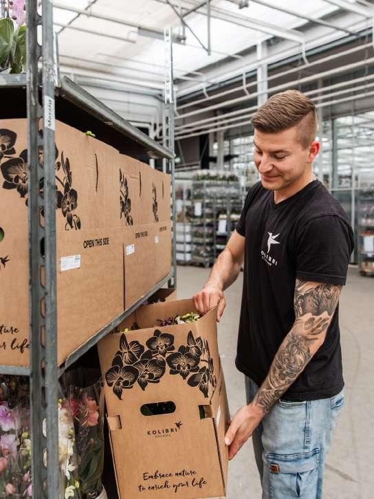 Packaging | We offer our customers sustainable alternatives, such as cardboard packaging. This way, everyone can consciously choose a more environmentally friendly solution. Our Kolibri Orchids are packed in recyclable cardboard boxes – a full alternative to the plastic tray and cover.
