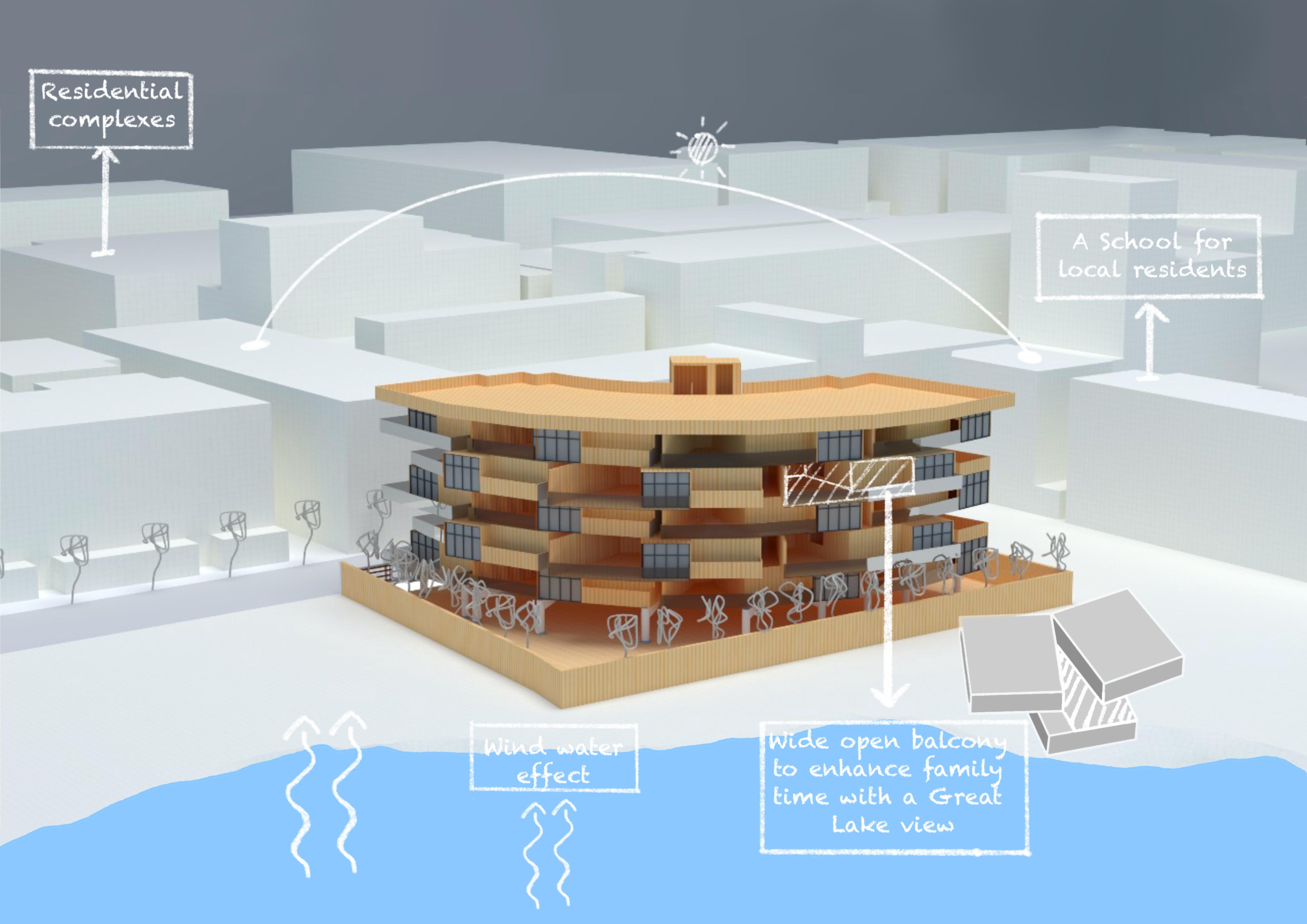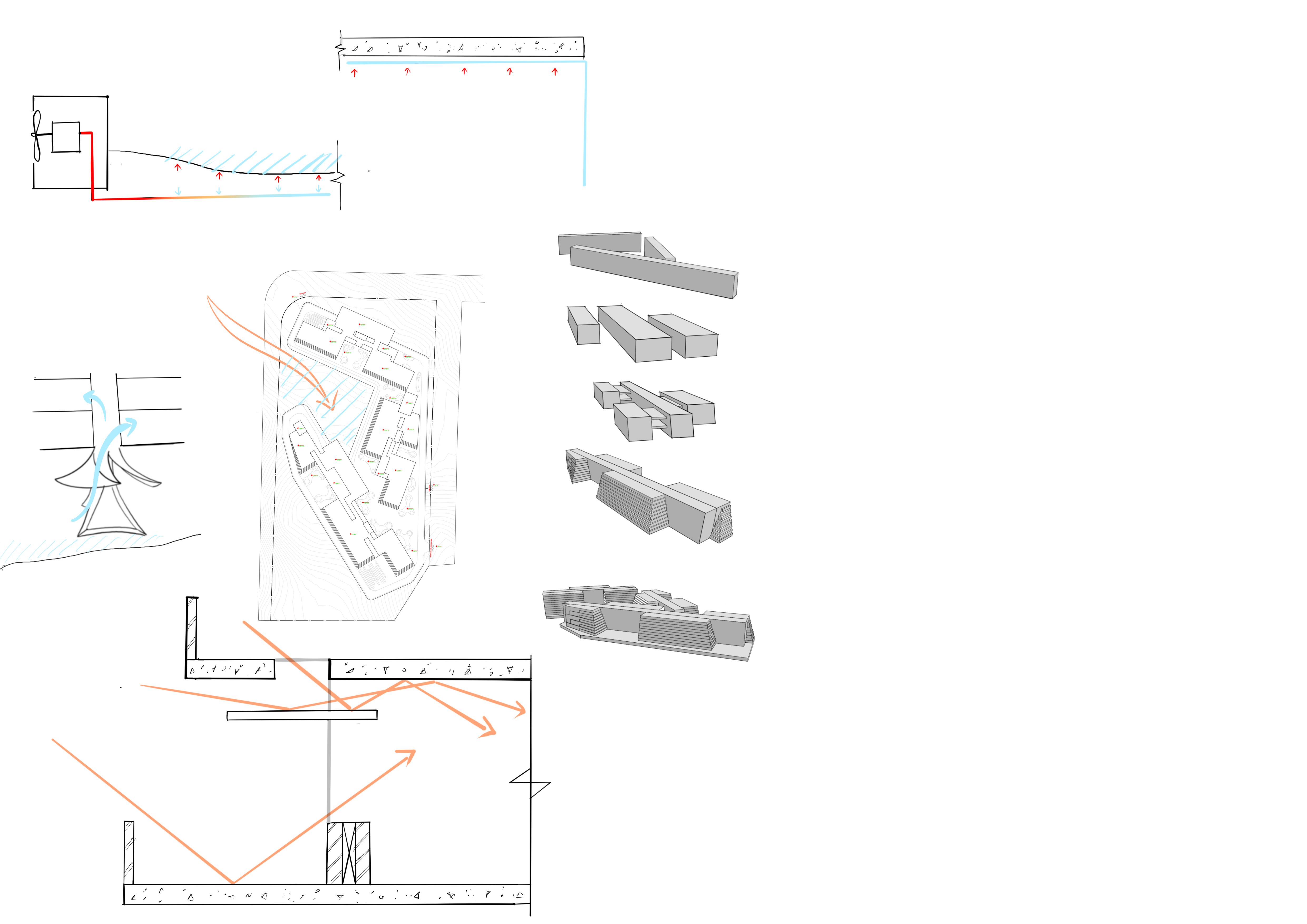 In order to cool down and trap the summer winds, the massing is dependent on site forces such as wind direction, sun path, and contours.