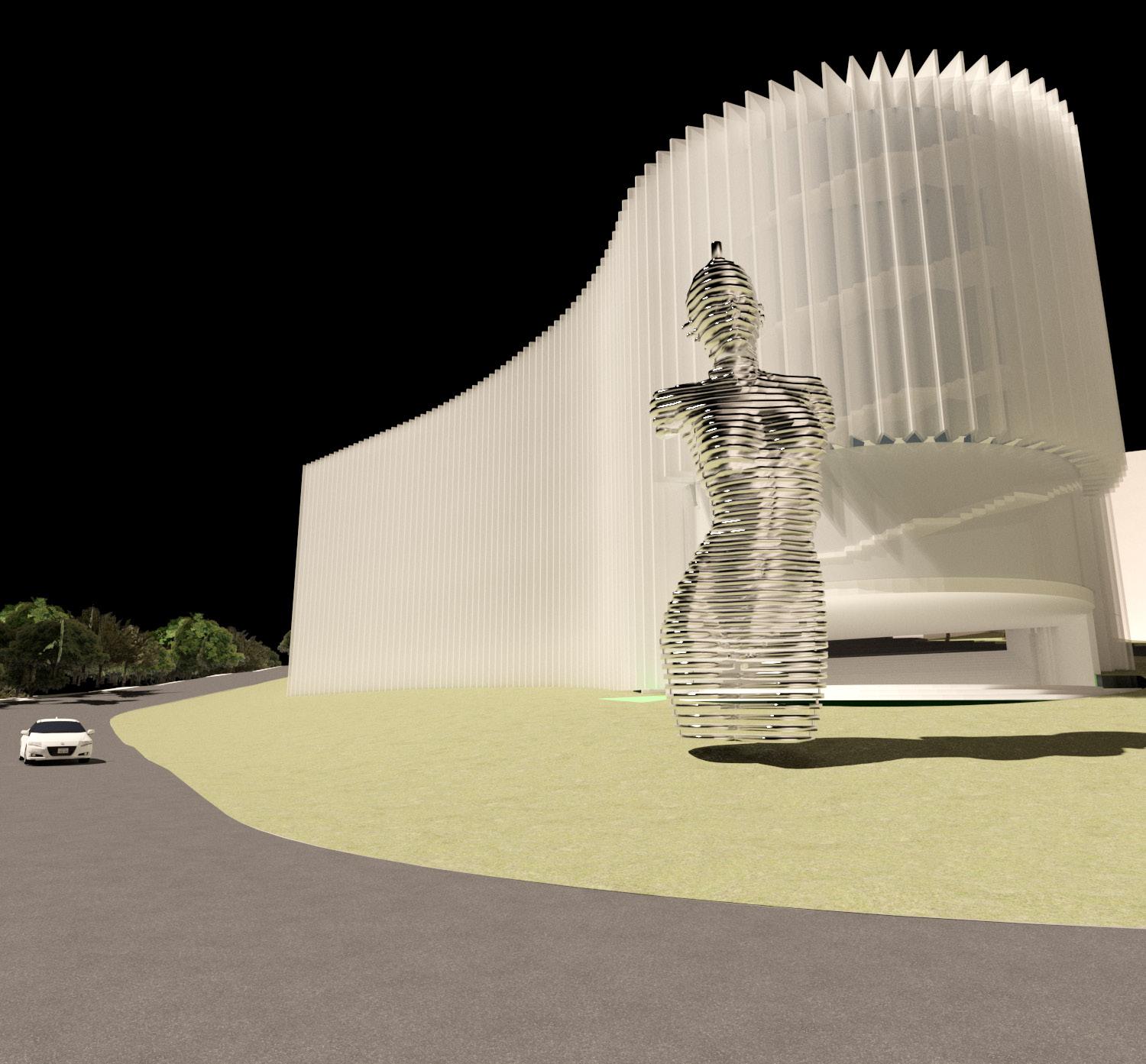 The main idea is to use design principles to create an amazing experience for the audience. In this case, contrast is achieved by having sharp edges throughout the exterior and soft curves throughout the interior.