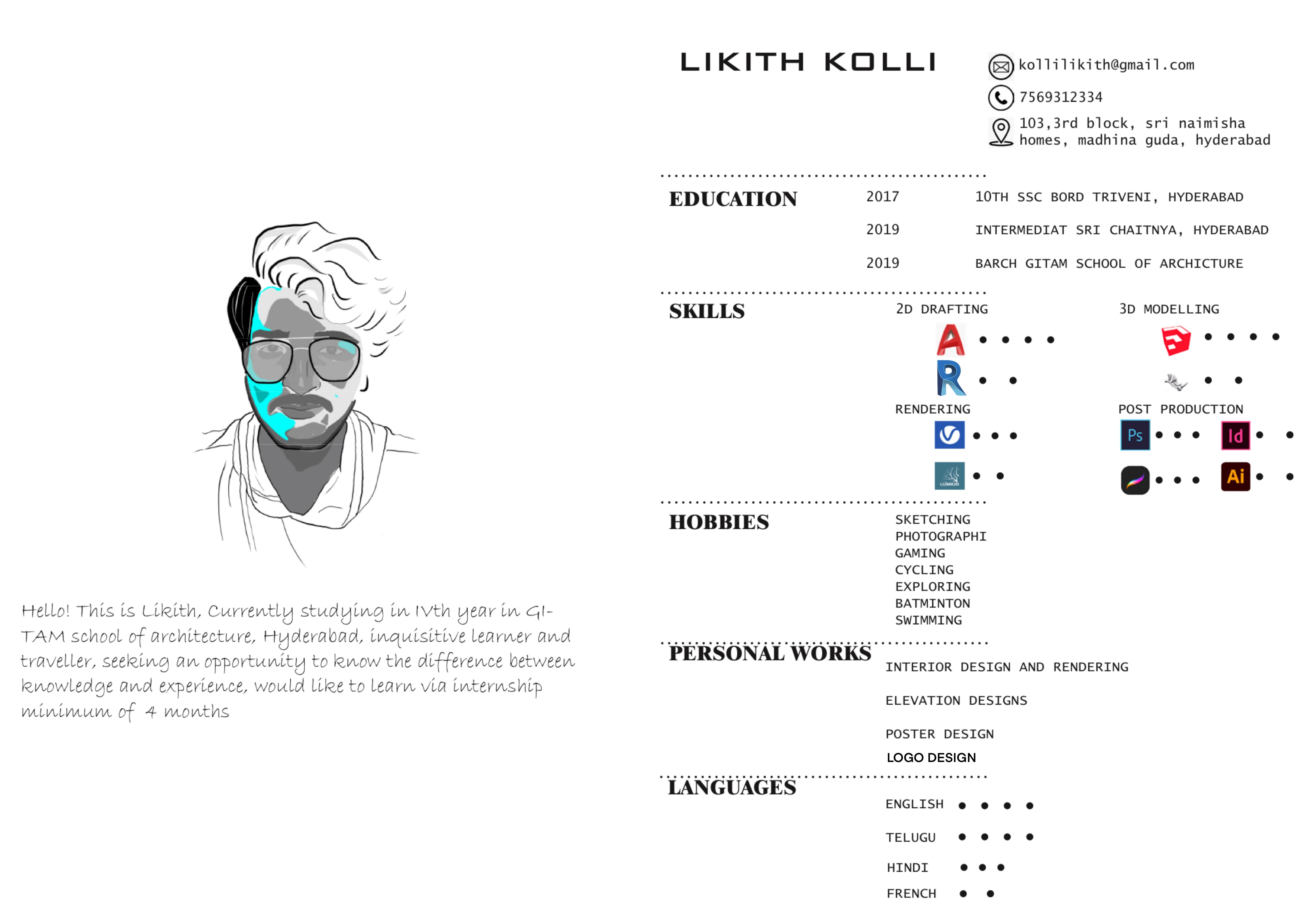 Hello! This is Likith, a freshly passed out architect GITAM school of architecture, Hyderabad , I am eager to bring my passion for innovative design and problem-solving to a dynamic and challenging role. Throughout my academic journey, I have developed a strong foundation in architectural principles, coupled with a keen eye for detail and a commitment to sustainable and functional design.