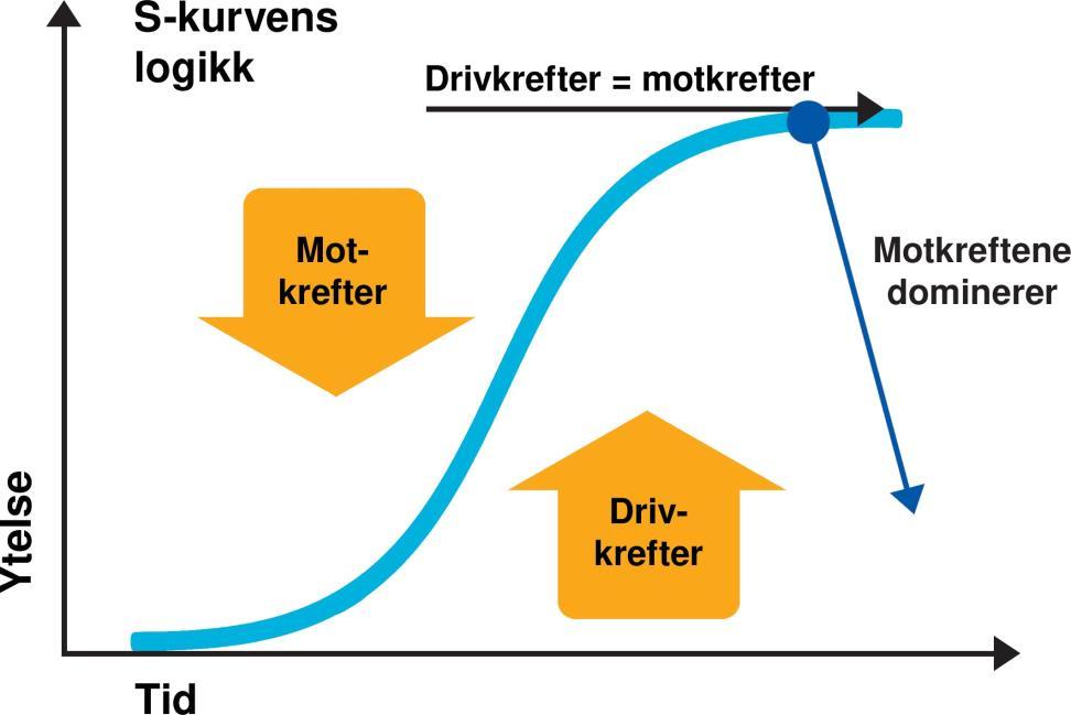 The drivers of the performance S-curve can be seen as the sum of everyone's efforts for a better everyday life. But most driving forces also have an inherent ability to produce counter-forces. The global striving for a better everyday life as a driving force has resulted in climate change becoming a counterforce. The balance point of the S-curve in this context illustrates the political mantra of "growth and protection", where the desire for growth is the driving force, with protection as a counterforce.