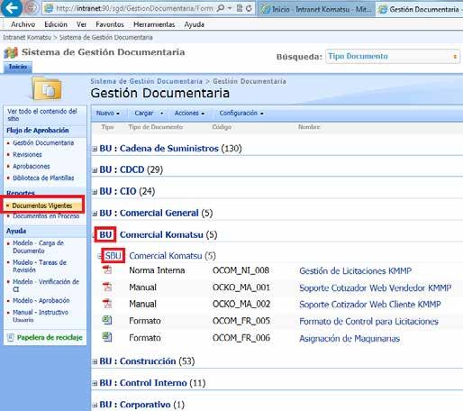 En esta zona encontrarás los documentos internos agrupados por BU/ SBU (Hacer clic en la palabra “BU/ SBU“ para desplegar)
