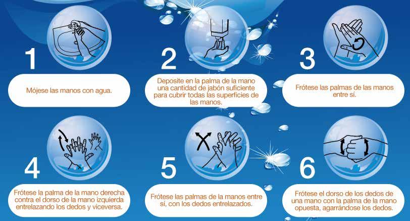 ¡ Lávese las manos solo cuando esten visiblemete sucias! Si no, utiliza la solución alcohólica. Duración de todo el procedimiento: 40-60 segundos.
