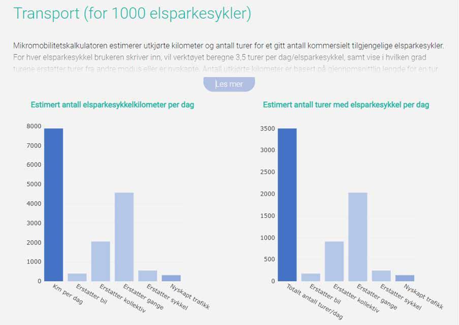 Skjermdump av kalkulatoren. Her kan du blant annet se hvordan 1000 nye elsparkesykler påvirker andre transportalternativer.