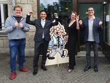 29. Juni: Daumen (& Fäuste) hoch … Glücklich, freudig & v. a. dankbar: Prof. Dr. Ulf-Dietrich Braumann (Bürgerinitiative Capa-Haus), Ken Toko (bis 2023 USGeneralkonsul für Mitteldeutschland), Dr. Nora Pester (Verlag Hentrich & Hentrich) & Museumsdirektor Hartinger. Mit dem Einzug des Verlags & neugegründeter CAPA Culture gGmbH ist ein Meilenstein für das Capa-Haus erreicht.