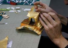 Aus welchen Leipziger Wahrzeichen sollte die Krippe bestehen und welche typischen Leipziger Figuren gehören hinein? Andrzej Malik, hauptberuflich Architekt und schon seit seiner Kindheit mit dem Krippenbau vertraut, entwarf die Krippe zunächst am Bildschirm und ließ die Einzelteile dann von einem Laser aus dünnen Holzplatten schneiden. Im November 2023 machte er sich auf nach Leipzig. An einem Wochenende kurz vor Ausstellungseröffnung schaffte das Krippenbauteam dann das, wofür man sonst eigentlich Monate braucht: die Krippe zusammensetzen, mit glitzerndem Papier verzieren und die Figuren erstellen. Pünktlich zur Eröffnung der Ausstellung und des Leipziger Weihnachtsmarktes am Dienstag, den 28. November 2023, wurde die Leipzig-Krippe, ganz nach Krakauer Manier, durch die Innenstadt bis zu ihrem Platz im Alten Rathaus getra-