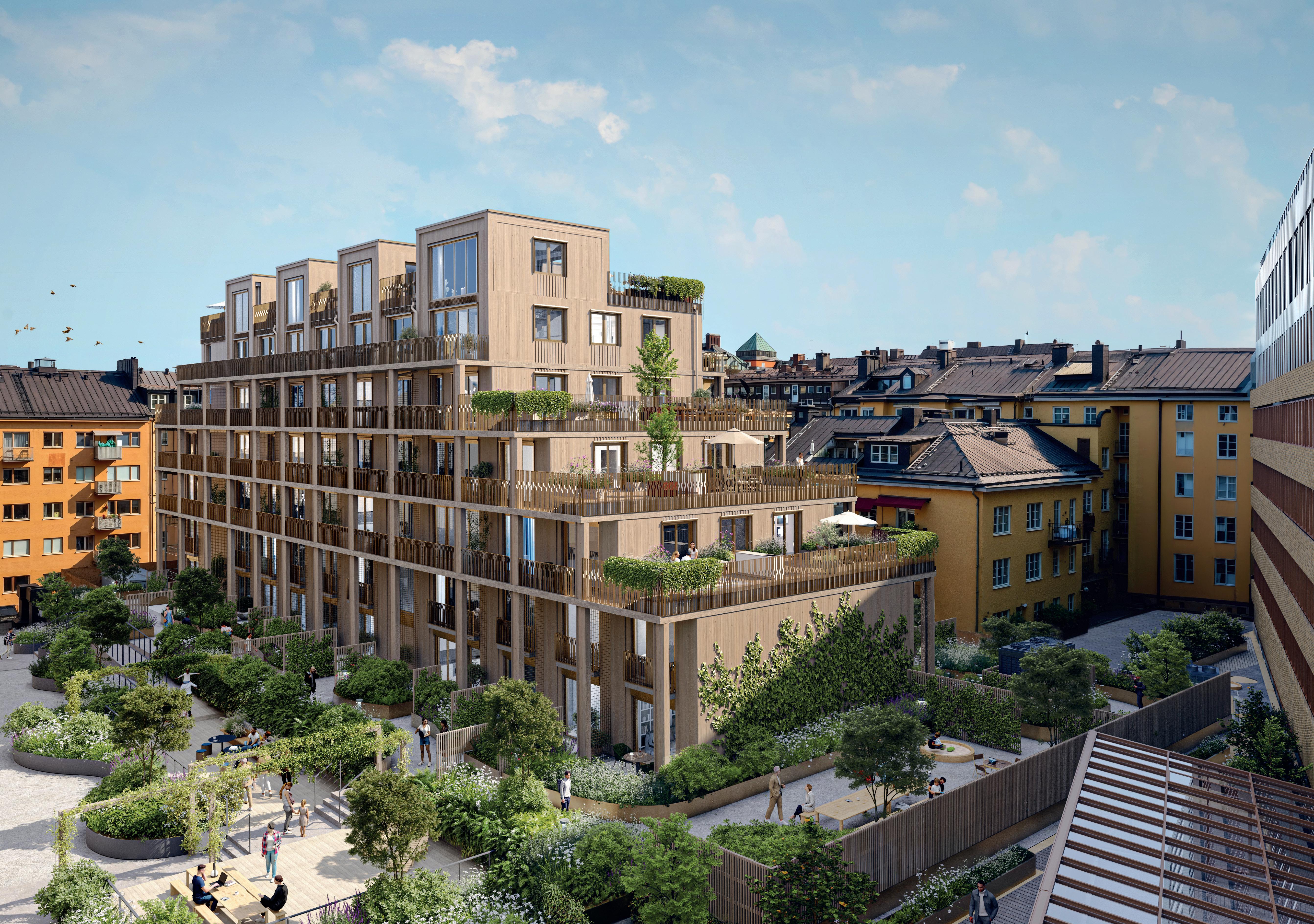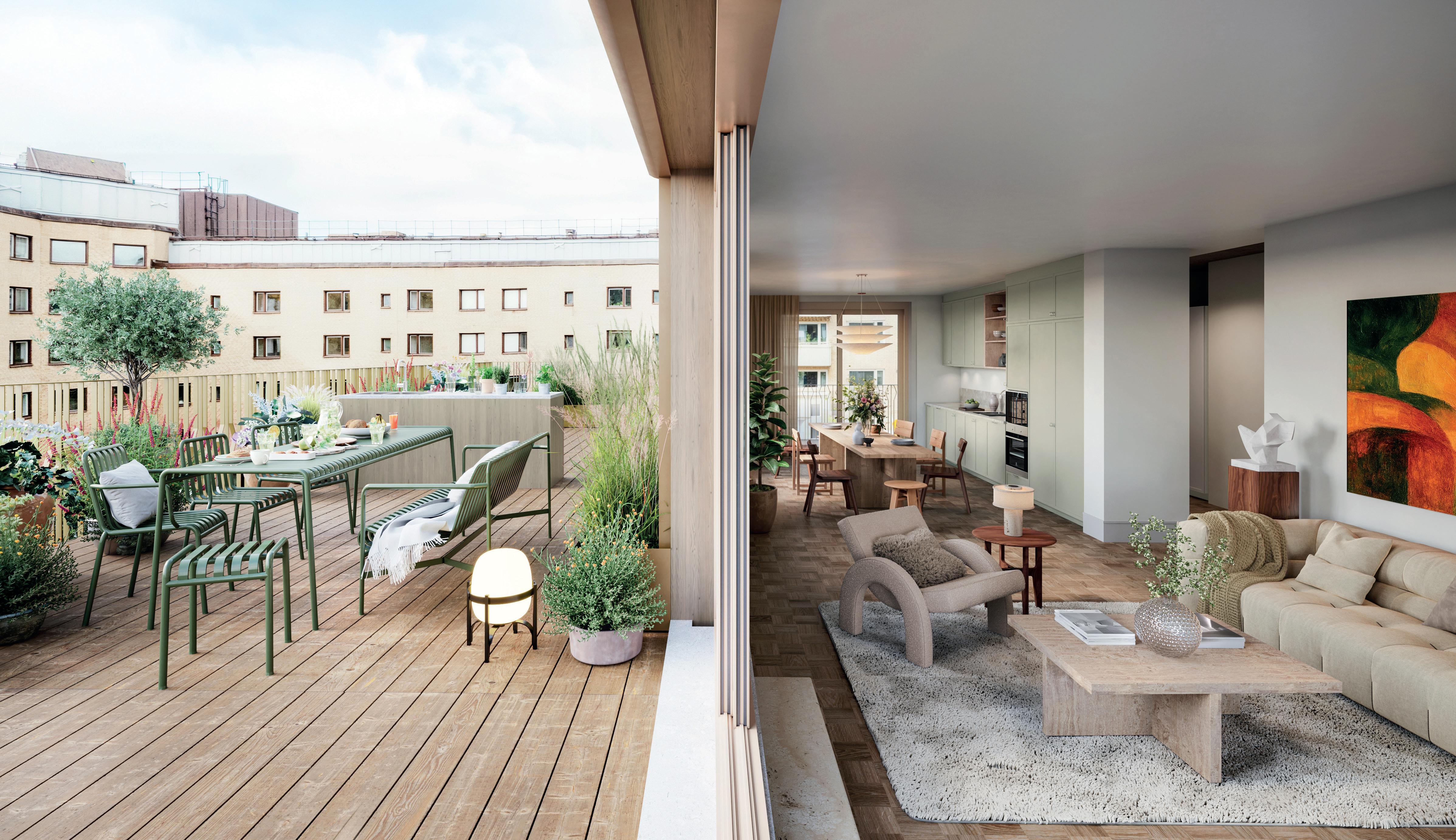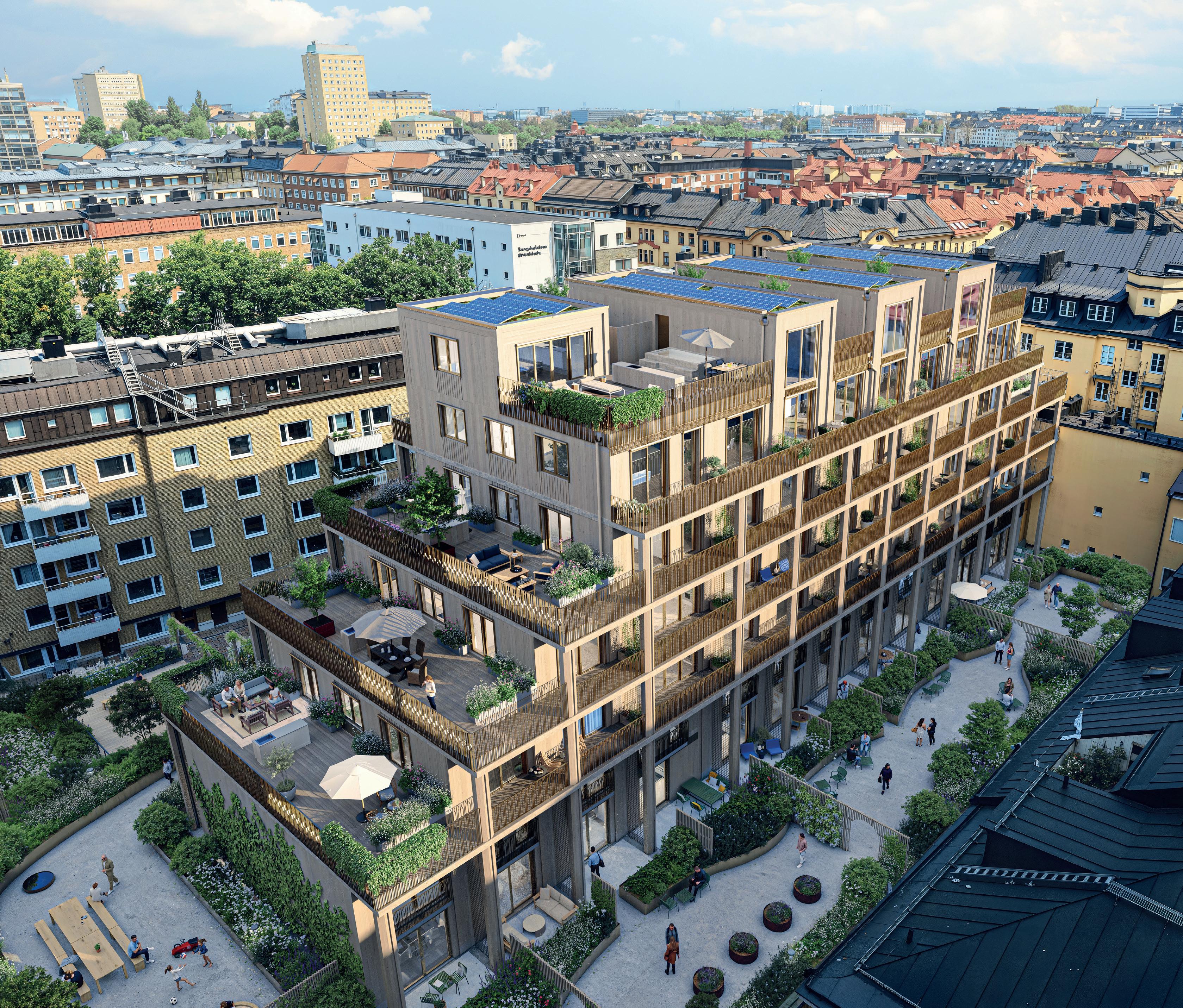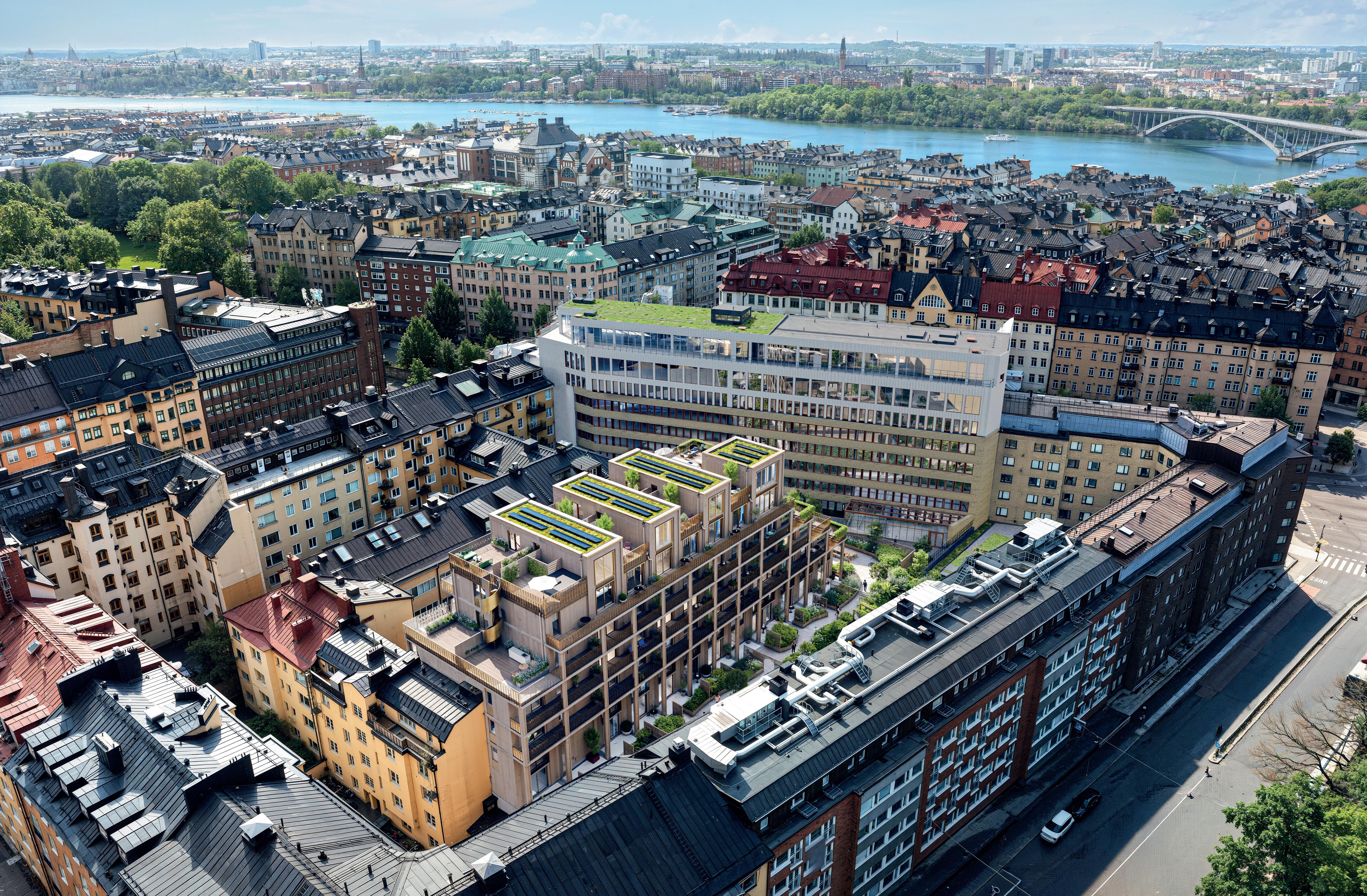 Högst upp i huset ligger etagelägenheter med solrika takterrasser och marknivå hittar du stadsradhus i två våningar med egen ingång och uteplats. På våning sex väntar en gemensam takterrass med utekök, som ger alla i huset en möjlighet att njuta av middagar kvällssol.