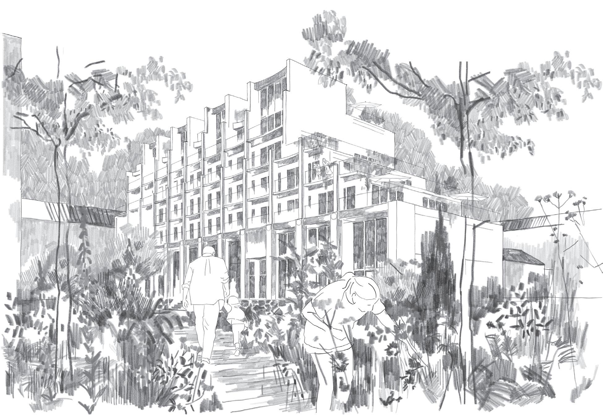 När vi ritade Gårdslunden ville vi skapa en plats som överraskar. Ett projekt där kontraster är vägledande – det urbana och det stillsamma, det moderna och det tidlösa, där samtida arkitektur möter tradition. En plats där stadens puls möter en grön och skyddad värld.