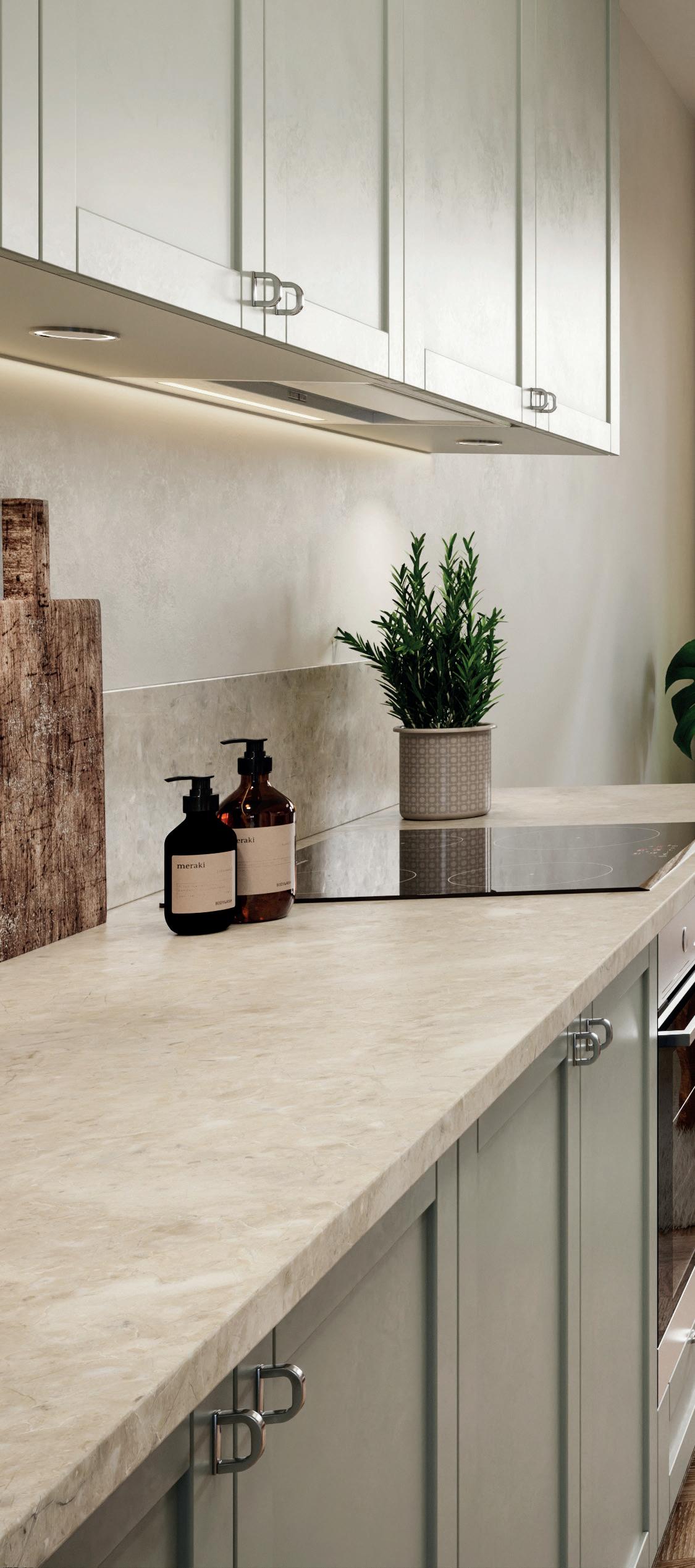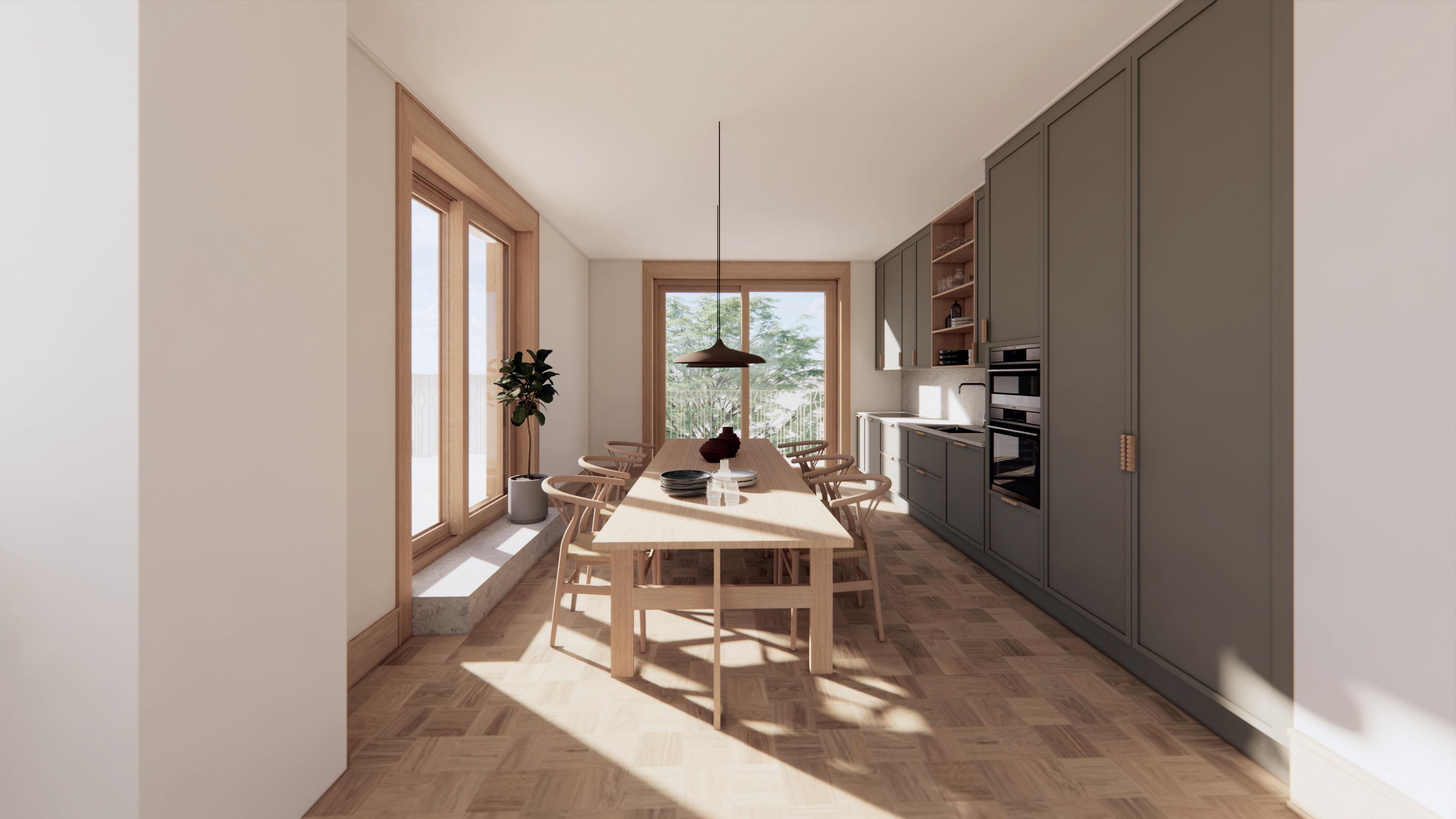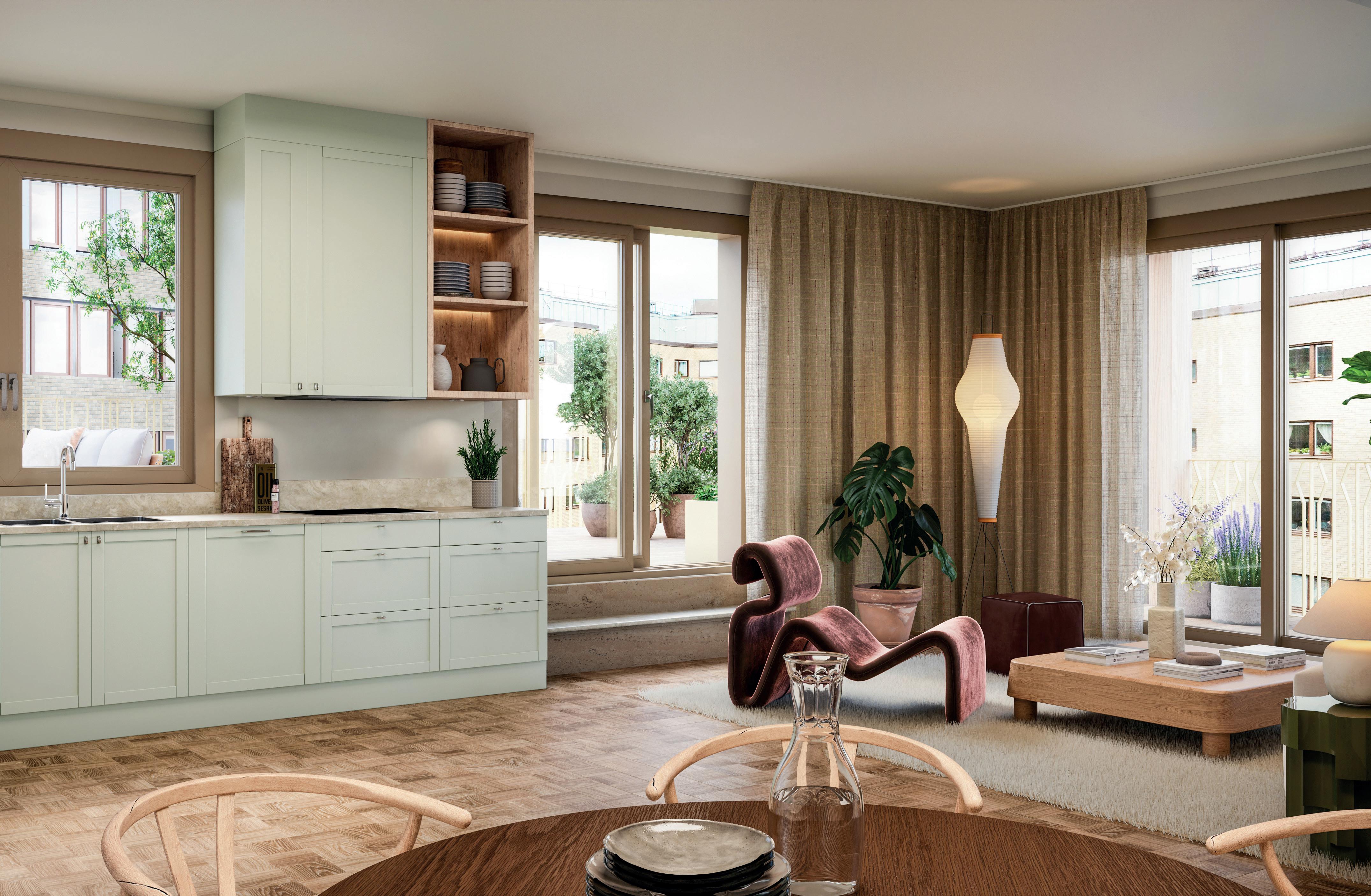 Köket är utformat med en klassisk ramlucka och går i en grågrön ton som vackert speglar gårdens grönska. Här möts funktion och form ett välutrustat kök som nyttjar takhöjden. Platsbyggda ekhyllor förhöjer kökets personlighet och karaktär. Bänkskivan kalksten tillför ett levande uttryck med naturliga skiftningar. Bilden föreställer bostad 26M.
