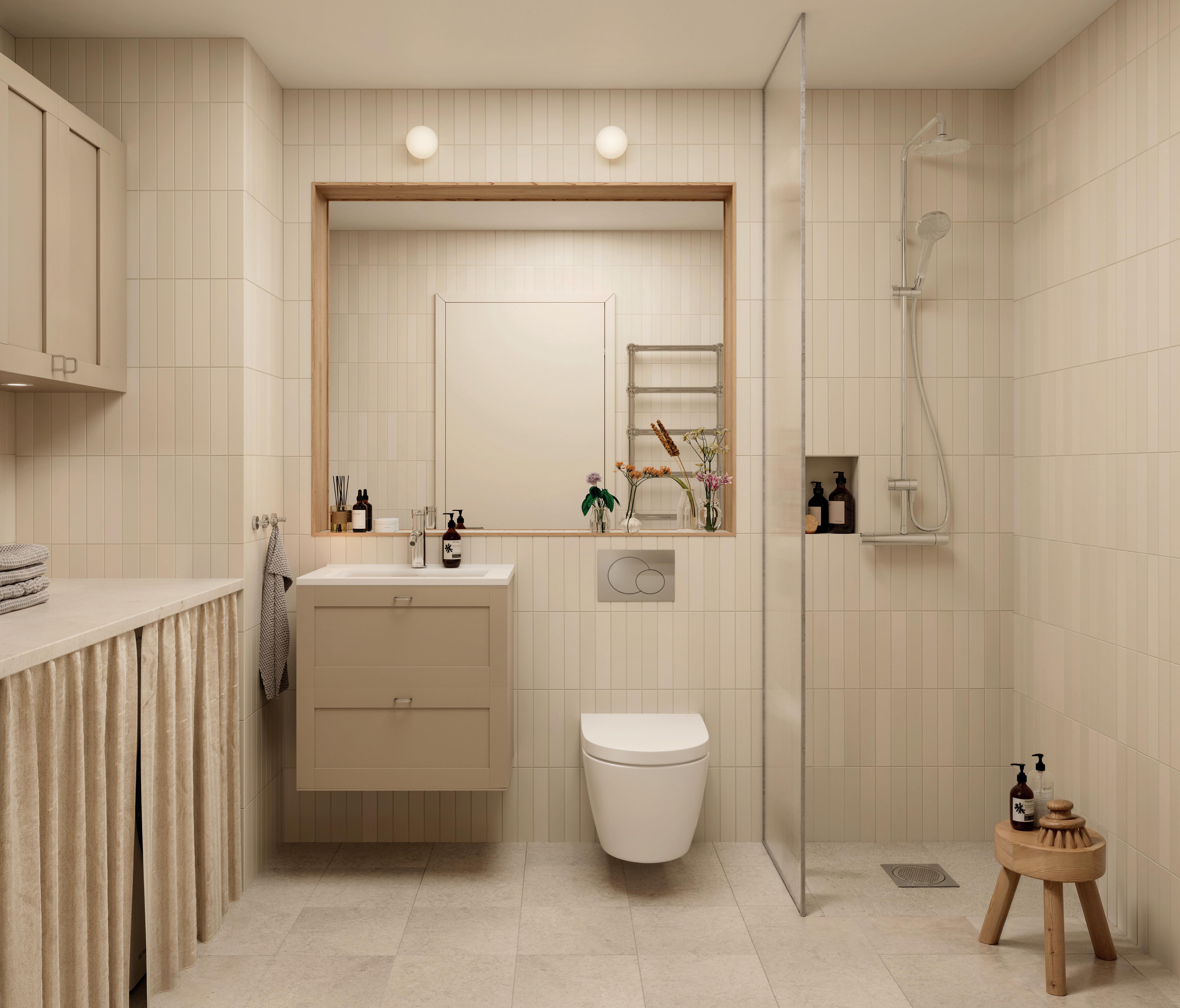 Badrummet följer samma harmoniska linje med en ljus och sober färgskala. En varmbeige bas och ett kakel med subtila variationer ger en lugn och sofistikerad helhet. Randat glas, kromdetaljer och ekinslag skapar ett elegant uttryck. Bilden föreställer bostad 26L-1303.