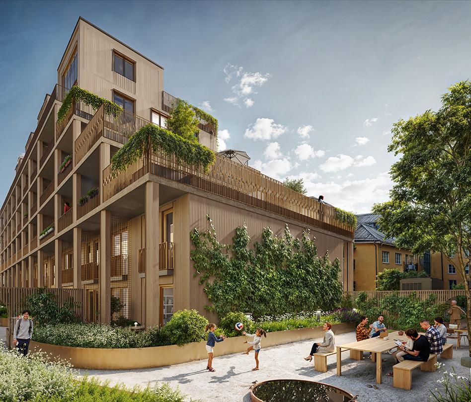 Färgskalan är varsamt anpassad efter platsen och den omgivande bebyggelsen för att skapa en harmonisk förankring i området. Den ljuspigmenterade träfasaden reflekterar ljuset mjukt mot grannhusen och lyfter fram gårdens grönska. Strukturen bärs upp av ståtliga pelare som ger byggnaden en kraftfull resning.