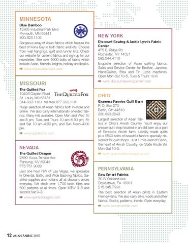 missouri The Quilted Fox 10403 Clayton Road St. Louis, M0 63131 314-993-1181 toll free 877.993.1181 Huge selection of Asian fabrics both in-store and online. We also carry internationally oriented fabrics. Many kits available. Open Mon and Wed 10 am–5 pm; Tues and Thurs 10 am–6:30 pm; Fri and Sat 10 am–4:30 pm, and Sun Noon–4:00 pm. www.quiltedfox.com