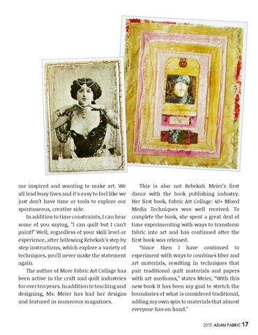 me inspired and wanting to make art. We all lead busy lives and it’s easy to feel like we just don’t have time or tools to explore our spontaneous, creative side. In addition to time constraints, I can hear some of you saying, ”I can quilt but I can’t paint!” Well, regardless of your skill level or experience, after following Rebekah’s step by step instructions, which explore a variety of techniques, you’ll never make the statement again. The author of More Fabric Art Collage has been active in the craft and quilt industries for over ten years. In addition to teaching and designing, Ms. Meier has had her designs and featured in numerous magazines.
