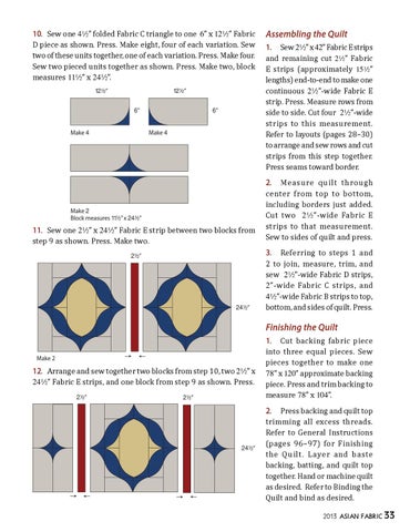 Assembling the Quilt 1. Sew @2” x $@” Fabric E strips and remaining cut @2” Fabric E strips (approximately !%2 ” lengths) end-to-end to make one continuous @2”-wide Fabric E strip. Press. Measure rows from side to side. Cut four @2”-wide strips to this measurement. Refer to layouts (pages 28–30) to arrange and sew rows and cut strips from this step together. Press seams toward border. 2. Measure quilt through center from top to bottom, including borders just added. Cut two @2”-wide Fabric E strips to that measurement. Sew to sides of quilt and press. 3. Referring to steps 1 and 2 to join, measure, trim, and sew @2”-wide Fabric D strips, @”-wide Fabric C strips, and $2”-wide Fabric B strips to top, bottom, and sides of quilt. Press.