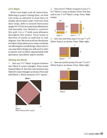 Let’s Begin Before you begin read all instructions. Referring to project Cutting Chart, cut First Cuts strips as indicated in chart then cut smaller pieces listed under Next Cuts from these strips. Refer to General Instructions (pages 96–97) for Accurate Seam Allowances and Assembly Line Method to construct this quilt. Use a 4”-wide seam allowance throughout this project. Press seams in direction of arrows as indicated in each diagram. Note: We used an all over floral print for Fabric A that allows us to rotate our blocks not affecting the overall design. If you select a one-way fabric design you will need to refer to layouts and cut fabric appropriately with placement, extra fabric may be needed.