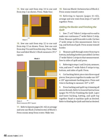 17. Refer to layouts pages (41–42), to arrange and sew one Block 2 between two of Block 3. Press seams away from center. Make two