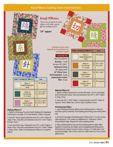 Backing ! yard Cut two !%” x @$2” Batting & Lining @^” square each 24” Pillow Form Kanji Appliqué Scrap Lightweight Fusible Web Scrap