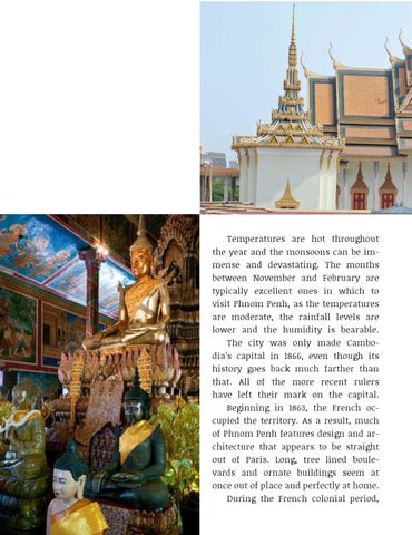 Temperatures are hot throughout the year and the monsoons can be immense and devastating. The months between November and February are typically excellent ones in which to visit Phnom Penh, as the temperatures are moderate, the rainfall levels are lower and the humidity is bearable. The city was only made Cambodia’s capital in 1866, even though its history goes back much farther than that. All of the more recent rulers have left their mark on the capital. Beginning in 1863, the French occupied the territory. As a result, much of Phnom Penh features design and architecture that appears to be straight out of Paris. Long, tree lined boulevards and ornate buildings seem at once out of place and perfectly at home. During the French colonial period,