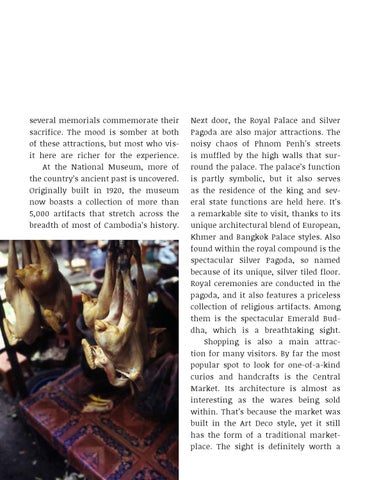 unique architectural blend of European, Khmer and Bangkok Palace styles. Also found within the royal compound is the spectacular Silver Pagoda, so named because of its unique, silver tiled floor. Royal ceremonies are conducted in the pagoda, and it also features a priceless collection of religious artifacts. Among them is the spectacular Emerald Buddha, which is a breathtaking sight. Shopping is also a main attraction for many visitors. By far the most popular spot to look for one-of-a-kind curios and handcrafts is the Central Market. Its architecture is almost as interesting as the wares being sold within. That’s because the market was built in the Art Deco style, yet it still has the form of a traditional marketplace. The sight is definitely worth a