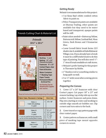 • 1” Bamboo rod or something similar to hang quilt on wall. • Use 4”-wide seam when sewing pieces together.