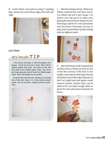 • A dry brush technique is used throughout this project. Touch tip of brush in paint. Paint will be slightly globby and shiny. Lay brush on flat side and drag across folded paper towel. Flip brush and drag opposite side of brush on folded paper towel. Brush will appear dry (no paint). • Using the flat side of brush, placing it on outside line of the leaf, drag it in a long stroke toward center. Do not use short, choppy strokes (no petting).