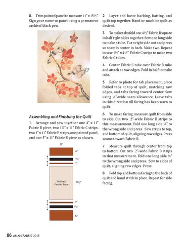 Assembling and Finishing the Quilt 1. Arrange and sew together one $” x !!” Fabric B piece, two !w” x !!” Fabric C strips, two !” x !!” Fabric B strips, one painted panel, and one %” x !!” Fabric B piece as shown. !!”