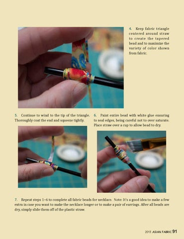 4. Keep fabric triangle centered around straw to create the tapered bead and to maximize the variety of color shown from fabric.