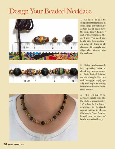 Design Your Beaded Necklace 1. C h o o s e b e a d s t o complement fabric beads in color, shape and texture. Be certain that all beads have the same inner diameter and will accomodate the cord size. The cord and beads used have an inner diameter of 3mm, so all elements fit snuggly and align when strung onto the necklace. 2. String beads on cording repeating pattern, checking measurement to obtain desired finished necklace length. Next, attach the toggle clasp (page 93) and begin to string beads onto the cord in desired pattern. 3. T h e c o m p l e t e d necklace should look like the photo at approximately 16" in length. If a longer necklace is desired, repeat pattern to obtain this length. Note: Cording length and number of beads needed will vary.