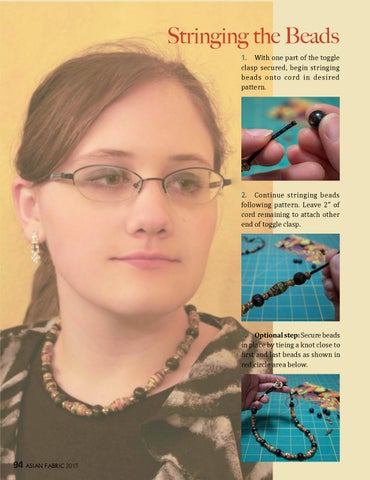 Stringing the Beads 1. With one part of the toggle clasp secured, begin stringing beads onto cord in desired pattern.