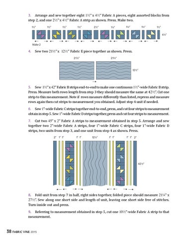 5. Sew !2â x $@â Fabric B strips end-to-end to make one continuous !2â-wide Fabric B strip. Press. Measure both rows length from step 3 they should measure the same at 4@2â. Cut one strip to this measurement. Note if rows measure differently than listed, repress and measure rows again then cut strips to measurement you obtained. Adjust step 4 unit if needed. 6. Sew !â-wide Fabric C strips together end-to-end, press, and cut four strips to measurement obtain in step 5. Sew !â-wide Fabric D strips together, press and cut four strips to measurement. 7. Cut two $%â x @â Fabric A strips to measurement obtained in step 5. Arrange and sew together two @â-wide Fabric A strips, four !â-wide Fabric C strips, four 1â-wide Fabric D strips, two units from step 3, and one unit from step 4 as shown. Press. @â !â !â