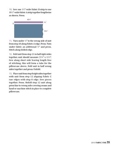 12. Fold unit from step 11 in half right sides together, unit should measure @!4â x !!2â. Sew along short side leaving length free of stitching, this will form a tube for the pillowcase sleeve. Fold unit in half wrong sides together and press. Unfold. 13. Place unit from step 8 right sides together with unit from step 12 aligning Fabric C raw edges with step 8 edge. Sew pieces together. Press. Refold step 12 unit along press line to wrong side covering seams and hand or machine stitch in place to complete pillowcase.