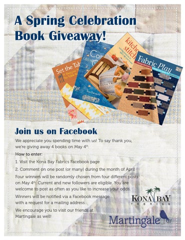 Join us on Facebook We appreciate you spending time with us! To say thank you, we’re giving away 4 books on May 4th. How to enter: 1. Visit the Kona Bay Fabrics Facebook page 2. Comment on one post (or many) during the month of April Four winners will be randomly chosen from four different posts on May 4th. Current and new followers are eligible. You are welcome to post as often as you like to increase your odds. Winners will be notified via a Facebook message with a request for a mailing address. We encourage you to visit our friends at Martingale as well!