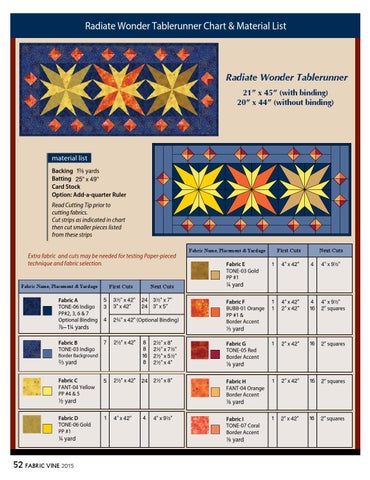 material list Backing !a yards Batting @%" x $(" Card Stock Option: Add-a-quarter Ruler Read Cutting Tip prior to cutting fabrics. Cut strips as indicated in chart then cut smaller pieces listed from these strips Extra fabric and cuts may be needed for testing Paper-pieced technique and fabric selection.