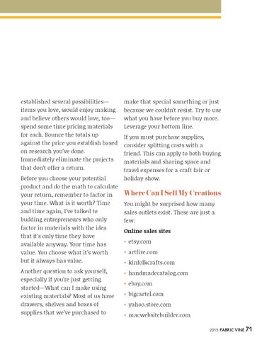 Where Can I Sell My Creations You might be surprised how many sales outlets exist. These are just a few: Online sales sites ⢠etsy.com ⢠artfire.com ⢠kinfolkcrafts.com ⢠handmadecatalog.com ⢠ebay.com ⢠bigcartel.com ⢠yahoo.store.com ⢠macwebsitebuilder.com 2015 fabric vine 71