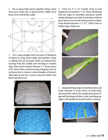 3. Use a long straight stitch because of thickness of fabrics to keep layers tight and together. Using a walking foot (if on-hand), stitch on marked lines starting from the middle and stitching to outside edge. Trim unit if needed. Measure !2â from corner at 45Ë, draw a line as shown in step 2 diagram, and cut on drawn line to remove corner triangles, if desired. (Blue/green unit has corners removed while red/ black unit does not.) 5. Along both long edges of unit find center and mark. Measure 3â from center on both sides, and mark this will be the handle placement (6â spread). Pin strap on Fabric A side, matching raw edges, with handle in toward center, as shown.