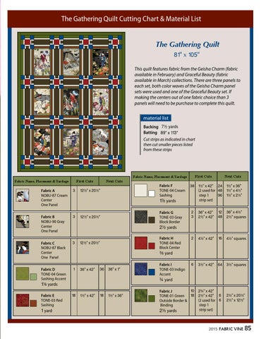 The Gathering Quilt Cutting Chart & Material List The Gathering Quilt *!" x !)%" This quilt features fabric from the Geisha Charm (fabric available in February) and Graceful Beauty (fabric available in March) collections. There are three panels to each set, both color waves of the Geisha Charm panel sets were used and one of the Graceful Beauty set. If making the centers out of one fabric choice than 3 panels will need to be purchase to complete this quilt.