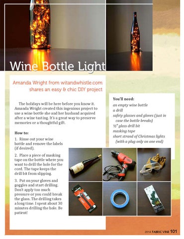 Wine Bottle Light Amanda Wright from witandwhistle.com shares an easy & chic DIY project The holidays will be here before you know it. Amanda Wright created this ingenious project to use a wine bottle she and her husband acquired after a wine tasting. It’s a great way to preserve memories or a thoughtful gift. How to:
