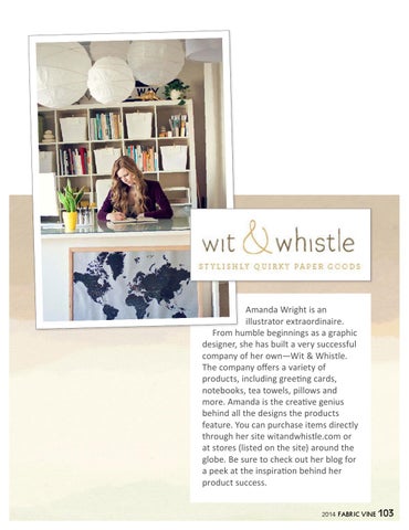 Amanda Wright is an illustrator extraordinaire. From humble beginnings as a graphic designer, she has built a very successful company of her own—Wit & Whistle. The company offers a variety of products, including greeting cards, notebooks, tea towels, pillows and more. Amanda is the creative genius behind all the designs the products feature. You can purchase items directly through her site witandwhistle.com or at stores (listed on the site) around the globe. Be sure to check out her blog for a peek at the inspiration behind her product success. 2014 fabric vine 103